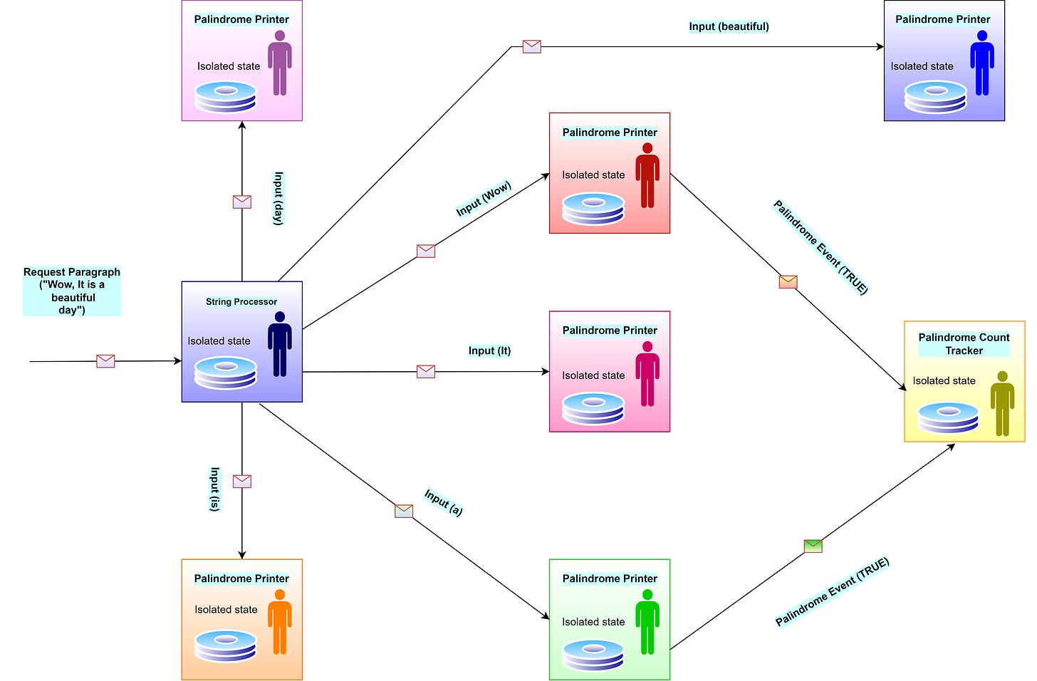 There are going to be multiple words in a paragraph. Determining whether a word is a palindrome or not is an independent task determined by the input word alone. This makes this task suitable for concurrency. Let’s try to use the actor model for achieving this concurrency in our system.
